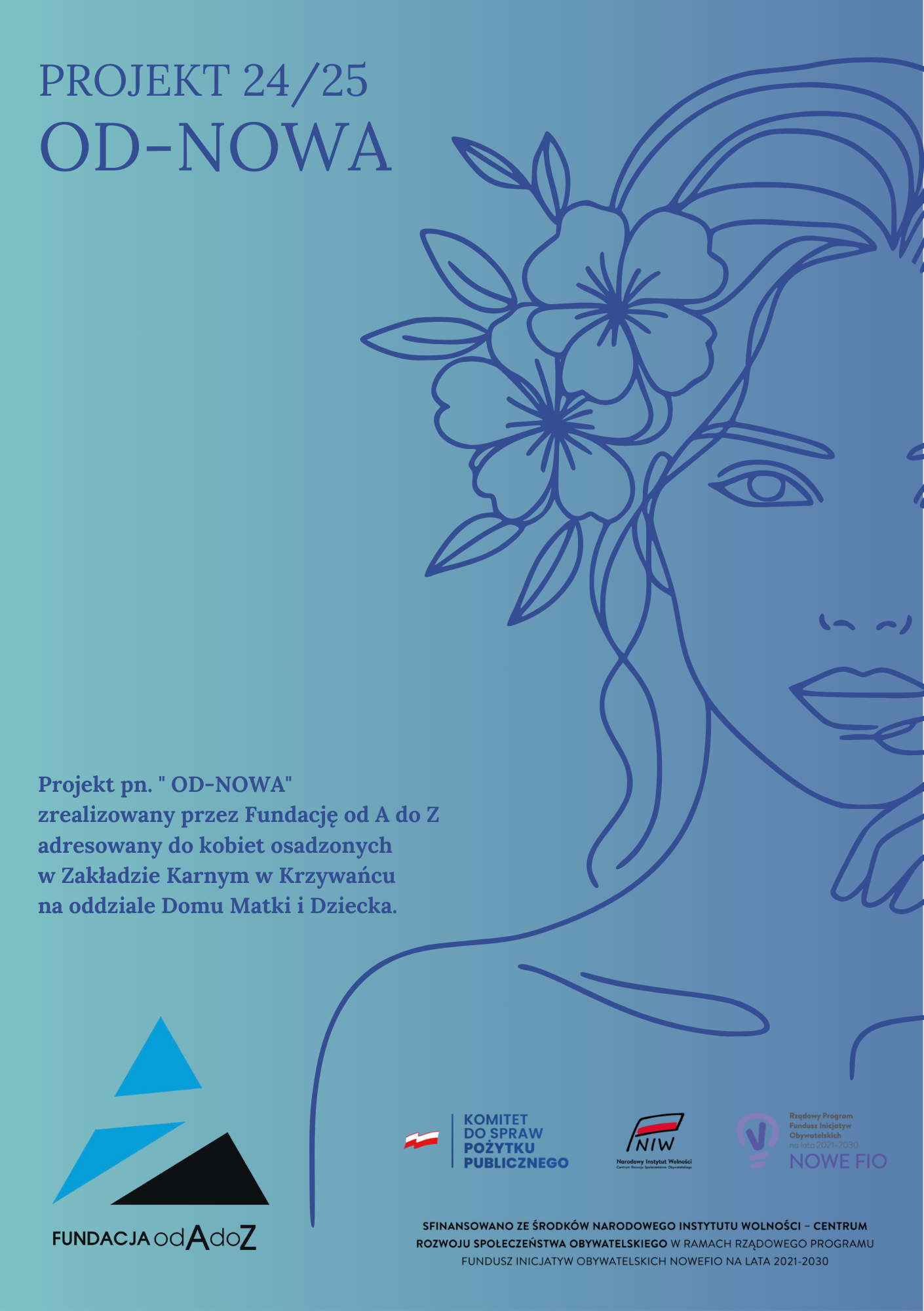 Z ogromną radością dzielimy się opracowaną broszurą informacyjną w ramach projektu „OD-NOWA” dofinansowanego z Programu Operacyjnego Fundusz Inicjatyw Obywatelskich. Projekt był skierowany do 10 osadzonych kobiet i realizowany w okresie 01.03.2024 – 31.12.2025 r. przez Fundację od A do Z z Zielonej Góry we współpracy z Zakładem Karnym w Krzywańcu.